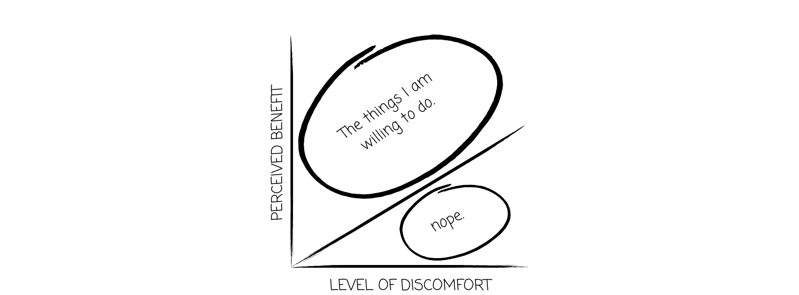 For most people, this is the typical decision-making matrix that we run every time we are faced with a decision. If we are going to do something, it has to be above the “discomfort vs. benefit line.” (Check out the graph*). What I mean is, if we are going to do something, it must provide more benefit than discomfort. Otherwise, our brains deem the task or discipline as “not worth it.”